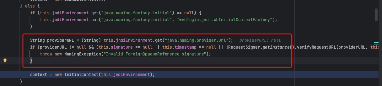 Compared to the previous JNDI injection vulnerability, this one doesn't seek a breakthrough in the key JNDI injection function of lookup. Instead, it focuses on the initialization phase of Context, thereby bypassing the patch of the previous vulnerability. I personally think it is a relatively interesting vulnerability. Oracle has performed signature verification on the setting of java.naming.factory.initial in subsequent patches. Undoubtedly, there are still some jndiEnvironment settings that can be set. As for whether new bypasses can be found, further research is needed.